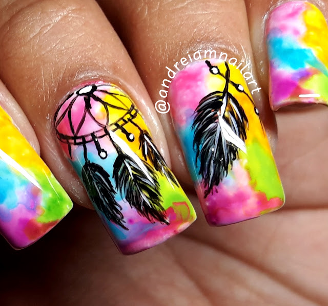 Fiz uma coloração estilo aquarela, usando álcool. É super fácil de fazer. É só escolher as cores que deseja. Colocar bem pouquinho em alguma superfície. Eu usei caixinha de leite. E com o pincel ir molhando no álcool e diluindo a tinta. Até ficar translucida. E aplicar nas unhas.